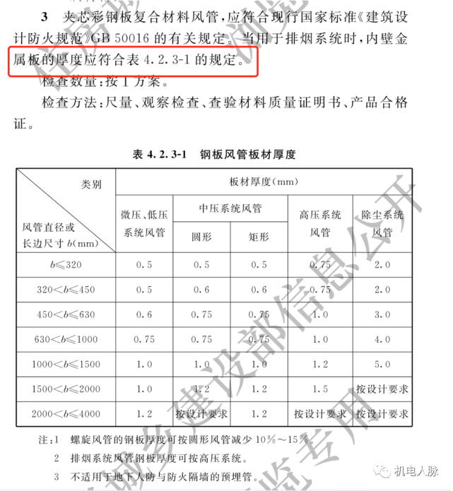 首先上述发文中提到的成品风管是:双面彩钢酚醛复合型风管,也不知市面上怎么有此防排烟风管?首先彩钢板厚度只有0.5mm,另外酚醛材料属于难燃B1级,不论老规新标准,此风管应该都不能使用在防排烟系统上。对于新标准,即使是彩钢板也要满足4.2.3-1的规定: