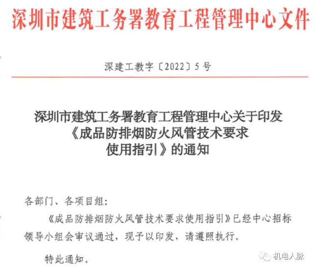 上述风管更换案例发生在深圳,2022年2月,深圳市建筑工务署教育工程管理中心印发了的通知,在这个通知中明确了深圳市新建项目和在建项目对成品防排烟风管的技术使用要求: